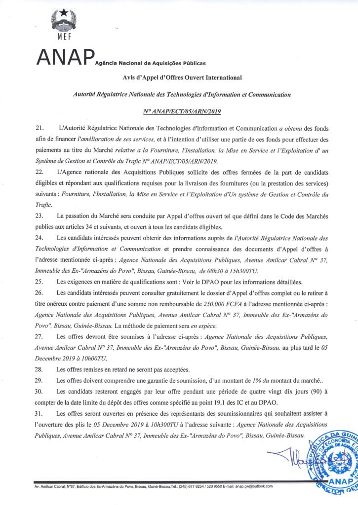 Avis d’Appel d’Offres International – Gestion et Controle de Trafic Sexta-feira, 1 Novembro, 2019 | Notícias | 0 comments Abrir o ficheiro em pdf
